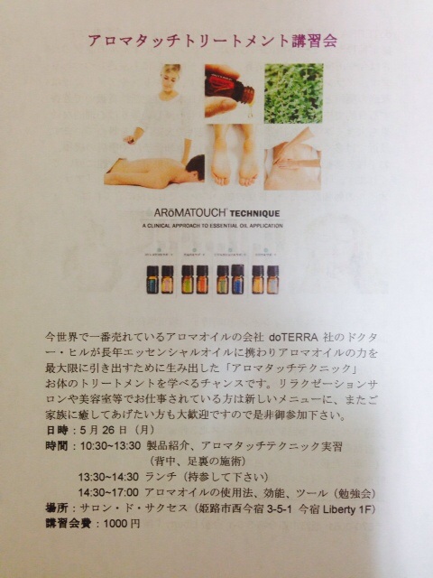 今、世界で一番売れているアロマオイルの会社doTERRAのエッセンシャルオイルを使って背中と足裏のトリートメントをします。40分の優しい簡単なマッサージなので誰もが学ぶ事ができます!話題の認知症予防に効くと言われてるオイルやダイエットに効果的なオイル、また頭痛、肩こり、腰痛に一瞬で緩和するオイルなど使い方や効能について盛り沢山!サロンで働いてる方や家族を癒してあげたい方、是非この機会に学びに来て下さい。